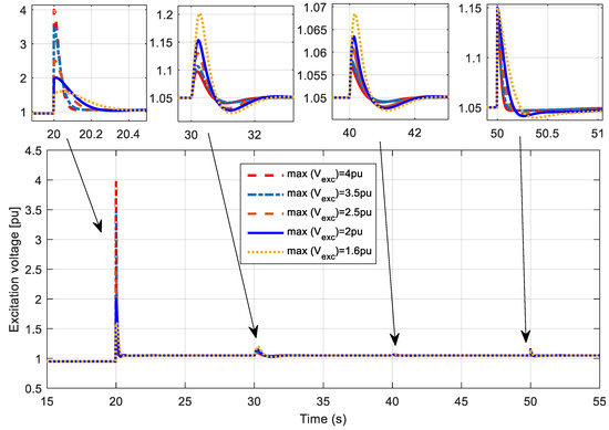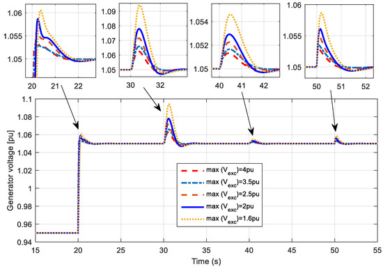 In Figure 9, a comparison is shown between the generator voltage’s responses to variations in the generator reference voltage (20 s), the signals following the regulator (30 s), the amplifier (40 s), and the exciter (50 s) outputs, respectively. All the step disturbances are assumed to have a value of 0.1 pu. Figure 10 shows a comparison of the excitation voltage responses. The results made it abundantly evident that the lower value of the maximum excitation voltage ensures both safe and secure operation of the machine and, at the same time, the slowest response to any disturbances. It is also evident that the highest impact on the excitation voltage change causes the change of the generator reference voltage. However, the highest impact on the generator voltage is the signal added to the output of the regulator.