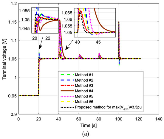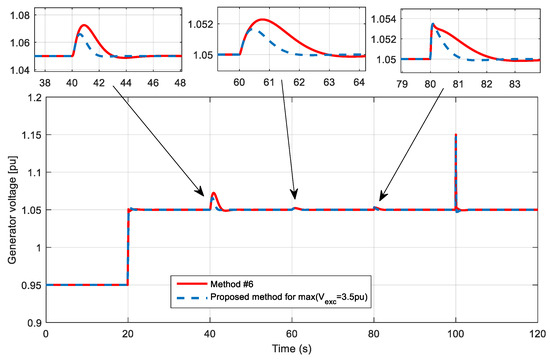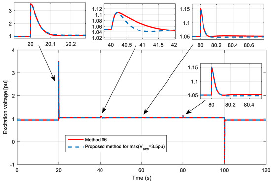 The proposed method for estimating the AVR regulator parameters is justified by comparing the results to those found in the literature, as illustrated in Figure 11 and Figure 12. In particular, it is evident from the results presented in the previous sections that Method #6 provides the generator voltage response when the excitation voltage is at its maximum value of 3.5 pu. We compared the generator and excitation voltage response simulation results in the scenario where the maximum excitation voltage is 3.5 pu.