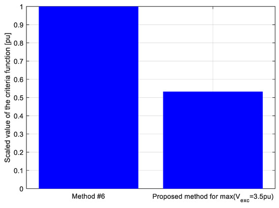 Using a novel method for estimating the parameters of the AVR regulator structure has a clear justification in light of the investigations presented. Additionally, it is evident, by looking at the value of the criteria function, that the outcomes obtained through the suggested methods are superior to those provided by Method #6 in terms of the objective function. In a scaled form, the corresponding results of the proposed method and Method #6 are shown in Figure 13.