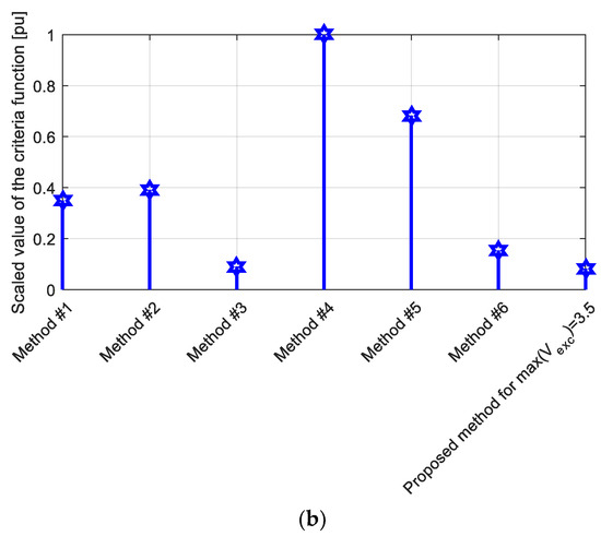 Finally, we compared the response of the generator voltage in the case of applying a step change on the reference value of the generator voltage, as well as changes in the signal at the output of the regulator, changes in the signal at the output of the amplifier, changes in the signal at the output from the exciter, and changes in the signal at the output from the generator voltage; the parameters being obtained by applying the literature methods described in [5,25], with the results being obtained using the proposed method using the parameters determined, with a maximum excitation voltage of 3.5 pu. As demonstrated by the results, the parameters derived from the proposed method enable the speediest elimination of step changes, the generator voltage reference value, and signal changes at the regulator’s output. This is most evident in the zoomed portions of the displayed figures. There is no doubt that this method yields the shortest settling time. Conversely, the value of the criterion function is also the smallest, as shown in Figure 14, confirming that the proposed method is accurate.