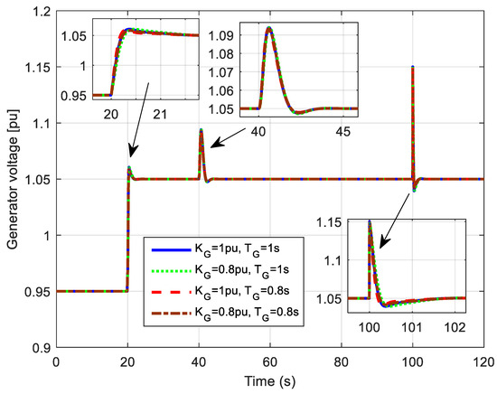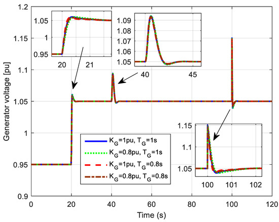 While analyzing the robustness of the proposed AVR parameters, the effect of altering the parameter values of the synchronous machines is observed. In other words, the gain and time constant fluctuate based on the load value. In order to achieve this, the values of the rise time, settling time, and overshoot, as well as the IAE values, are measured when the generator voltage reference changes and when the regulator output signal and the generator output signal change, respectively. The simulation step was assumed to be 10−4, and the values of all changes were assumed to be 0.1 pu. The maximum allowed excitation voltage values are shown in Table 6 for all parameters set for all values. Figure 15 and Figure 16 show the excitation voltage and the generator voltage for the maximum excitation voltage of 1.6 pu and various generator gain and time constant values. Based on the results, it is evident that the suggested approach (controller and parameters) ensures the system’s robustness to changes in the characteristics of the synchronous machines.