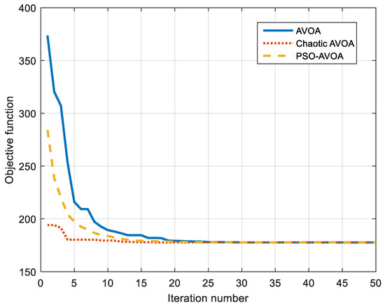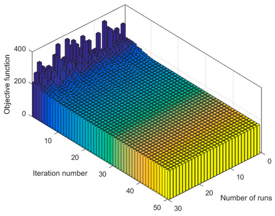 A 3D graph convergence curve resulting from the proposed method, which was initiated 30 times with 50 iterations between each start, is shown in Figure 17. As illustrated in Figure 18, the Chaotic AVOA, PSO–AVOA, and the standard AVOA compare the mean value and the convergence curve. The statistical processing of findings in the form of maximum, minimum, and mean values, and the comparison in terms of Wilcoxon’s rank-sum test, were carried out based on the provided results and numerous tests of each algorithm stated (Table 7).