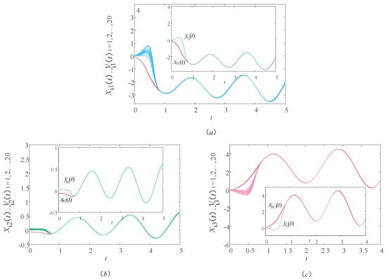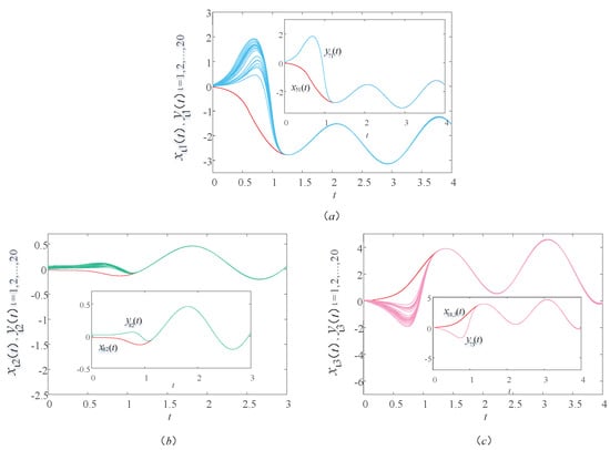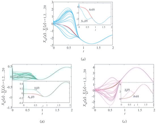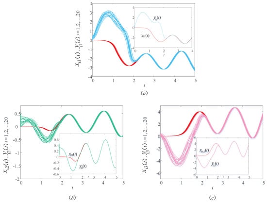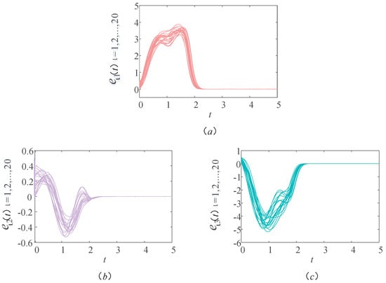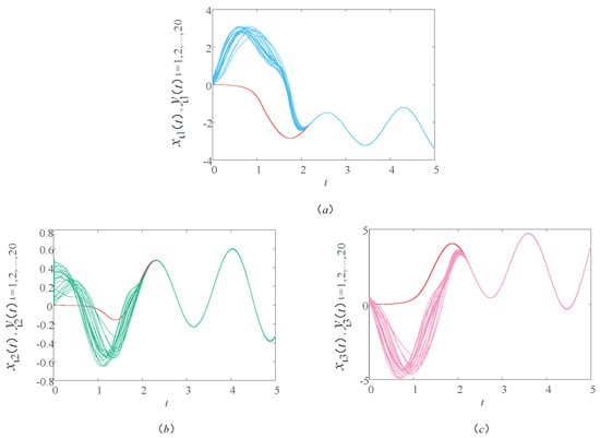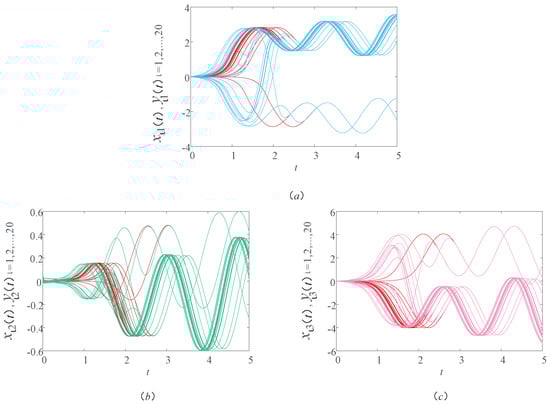 Figure 2 shows a sample path of the drive–response systems (9) and (10) with time delay . In order to see the trend of the image more clearly, a group of corresponding components are selected from each graph. In Figure 2a, the red and blue lines are the first components of the drive and response systems, respectively. In Figure 2b, the red and green lines are the second components of the drive and response systems, respectively. In Figure 2c, the red and pink lines are the third components of the drive and response systems, respectively. Unless otherwise stated in this article, the lines in the other figures represent the same meaning. In Figure 2, we observe that the image of the response system is consistent with the image of the drive system within a certain period of time. It indicates that the drive–response systems realize synchronization within a certain time under the action of the controller and updating laws. That is to say, in the actual bus system, through the bus scheduling, the actual operation of the bus stop can reach the ideal running state to achieve balance in a certain period of time. In this case, the time delay of bus operation and the waiting time of passengers can be minimized, thus ensuring the normal travel of residents and the balanced operation of the urban public transportation system.