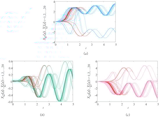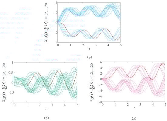 Likewise, the initial values, functions, and parameters are the same as Section 4.1. Figure 10 shows the sample path of the drive–response systems (9) and (14).