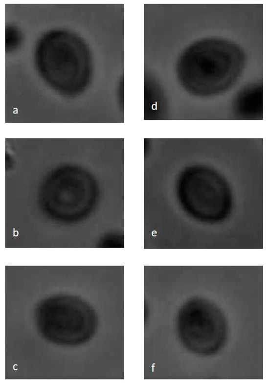 Intact Saccharomyces cerevisiae cells (a–c) compared with oxidopamine-treated cells (d–f). Despite visual similarities, the two groups show significant differences in nuclear fractal dimension and lacunarity, as observed through both conventional and differential volume variation approaches to fractal analysis.