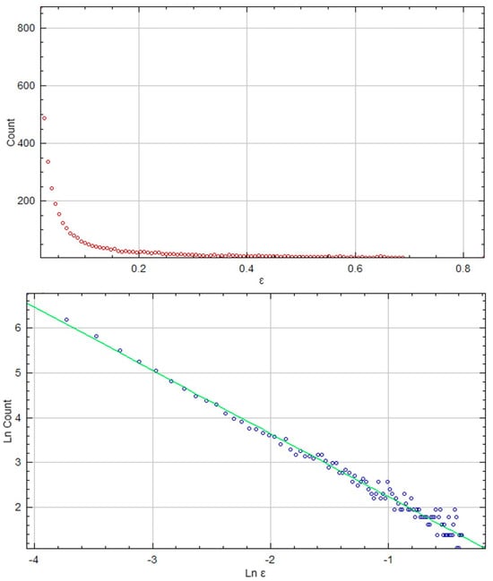 Fractal analysis of nuclear ROIs was performed in ImageJ (v. 1.53t, developed by Wayne Rasband and contributors, National Institutes of Health, Bethesda, MD, USA), and FracLac software for ImageJ designed by Dr. Audrey Karperien, the Charles Sturt University, Australia [14]. The details on the ImageJ software and its functions can be found in the previously published work [15]. This platform can efficiently compute a number of fractal indicators for a specified structural pattern in a digital image and has been previously used on numerous occasions in biomedical research [16,17,18]. We applied the box-counting method, in which a grid of boxes (two-dimensional squares) is superimposed over a pattern after which the program counts the number of boxes (N) that contain a part of the pattern. The process is repeated at different scales (ε), with different box sizes, after which a log-log graph is created representing the relationship between the box numbers and scales (Figure 2).