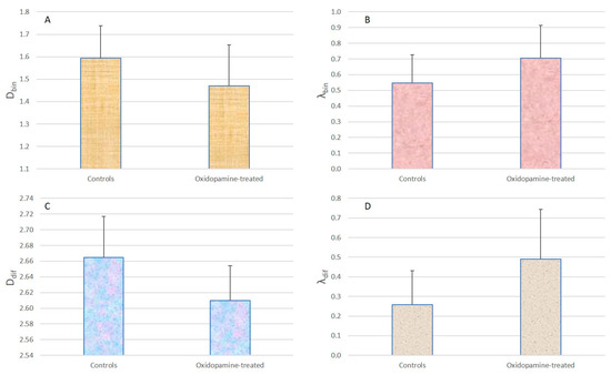 The average values of fractal dimension obtained from binarized ROIs using the standard box-counting method were 1.469 ± 0.183 in the oxidopamine-treated group and 1.594 ± 0.144 in the control group of cells (Figure 3). A statistically highly significant difference (p < 0.01) was observed between the groups. The mean values of lacunarity in the binarized ROIs in the control group was 0.548 ± 0.179, while in the oxidopamine-treated group, it significantly increased to 0.706 ± 0.208 (p < 0.01). When we applied the fractal analysis on non-binarized grayscale micrographs using the so-called “Differential Volume Variation” technique, we observed a similar reduction of fractal dimension and an increase in lacunarity values. The mean value of fractal dimension in the experimental group was 2.609 ± 0.044 and it was significantly (p < 0.01) lower when compared to the controls (2.665 ± 0.053). The average lacunarity in the controls was 0.258 ± 0.175 and in oxidopamine-treated cells 0.491 ± 0.253 (p < 0.01).