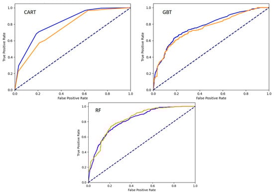 Receiver operating characteristic curves for the classification and regression tree (CART) model, gradient-boosting tree (GBT) model, and random forest (RF) classifier.