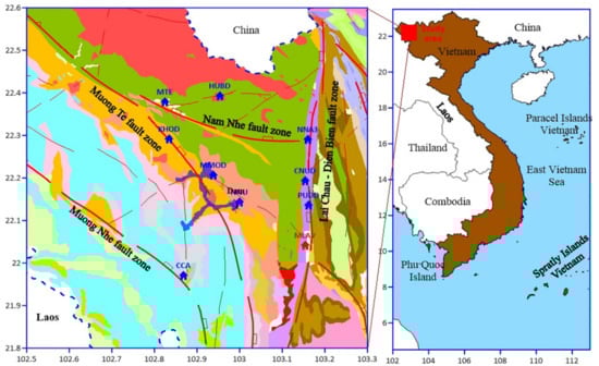 - Cao, D.T.; Le, V.D.; Pham, N.H.; Nguyen, H.T.; Mai, X.B.; Thai, A.T. Main structural units of the Earth’s crust in Northwest region of Vietnam. J. Earth Sci. 2004, 26, 244–257. [Google Scholar]