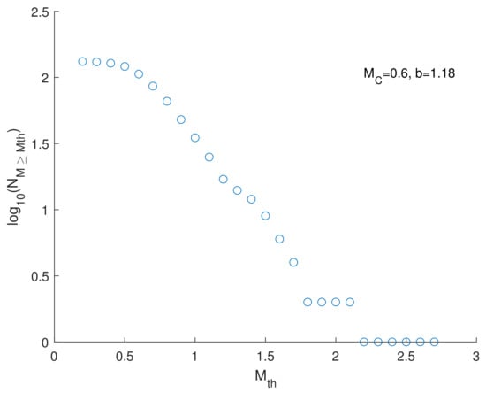 - Aki, K. Maximum likelihood estimate of b in the formula log(N) = a − bM and its confidence limits. Bull. Earthq. Res. Inst. Univ. Tokyo 1965, 43, 237–239. [Google Scholar]