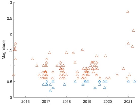- Wiemer, S.; Wyss, M. Minimum magnitude of completeness in earthquake catalogs: Examples from Alaska, the Western United States, and Japan. Bull. Seismol. Soc. Am. 2000, 90, 859–869. [Google Scholar] [CrossRef]