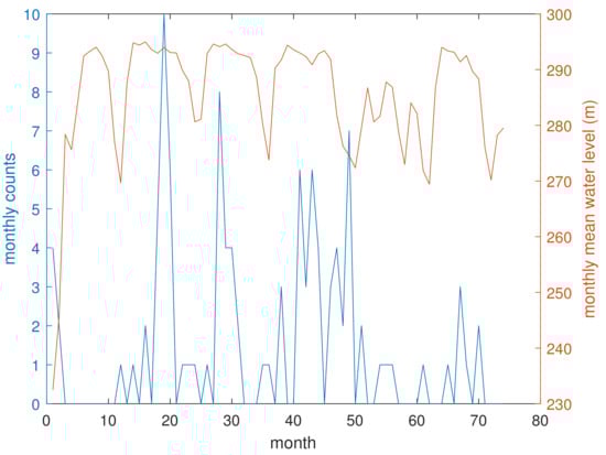 - Telesca, L.; Kadirov, F.; Yetirmishli, G.; Safarov, R.; Babayev, G.; Islamova, S.; Kazimova, S. Analysis of the relationship between water level temporal changes and seismicity in the Mingechevir reservoir (Azerbaijan). J. Seismol. 2020, 24, 937–952. [Google Scholar] [CrossRef]