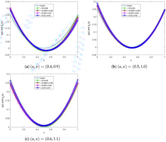 where k is the iteration step, and are the adjust parameters, and they are taken to be , , , and . Moreover, random noise is added to the exact data in the following way: