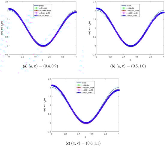 Suppose , where C is a positive constant. In this example, we take , , and initial guesses and for the numerical simulations. The inverse results for the various noise levels are shown in Table 1 and Table 2.
