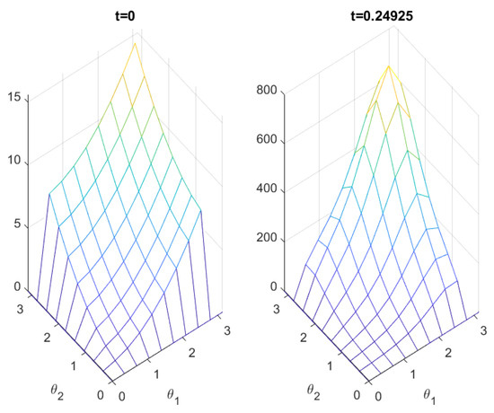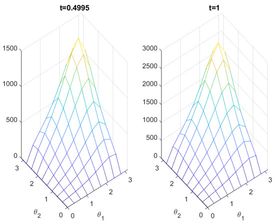 In this section, we provide numerical simulations of the application of Equation (38). This example includes several interesting and tricky parts that relate to approximating a numerical solution. If it merely contained a parabolic partial differential equation (PDE), we could solve it using a variety of software packages and the techniques detailed in the cited [38,39] sources. If there was merely a neutral delay term, we could apply the techniques in [40]. All of these elements are represented in this equation along with an integral term.