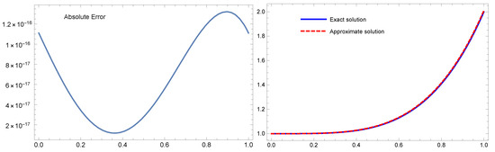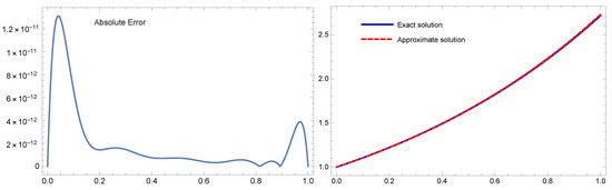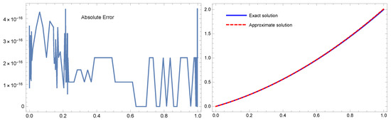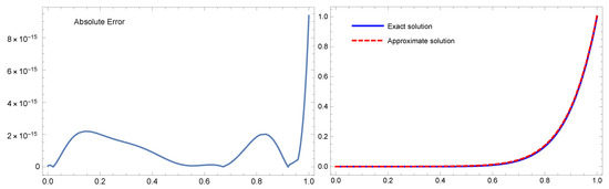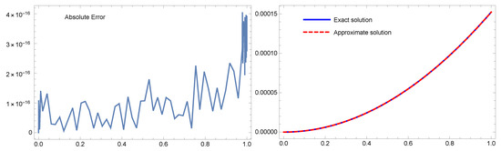 Table 5 shows a comparison between the absolute error results produced by the suggested approach with and the method provided by the orthonormal Bernoulli’s polynomials in [29] with for Example 4. For Example 4 with , Figure 4 plots the exact and numerical solutions on the right and the absolute error on the left. These results show that the recommended approach yields outcomes that are better than those reported in [29]. The analytical solution and the approximation appear to be nearly identical. Furthermore, the CPU time for the proposed method is lower and the results are better.