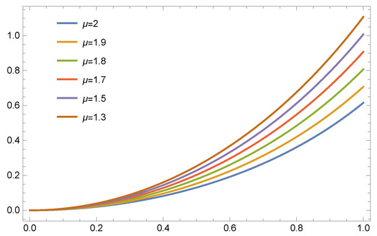 Although many definitions of the fractional derivatives exist, including the Riemann, Euler, Riesz, Liouville, Hadamard, Riemann–Liouville, Caputo, Caputo–Fabrizio, Marchaud–Hadamard, Atangana–Baleanu, conformable, and others [22,32,33], Caputo’s definition remains the most widely used because it has a physical meaning in many applications and fields of science. Researchers generally agree that Caputo’s definition fulfills the conditions of the fractional derivative. In the Caputo situation, the derivative of a constant is zero, and we may appropriately describe the initial conditions for the fractional differential equations, which can be handled by analogy to the classical integer case [33]. In this article, we study Equations (1)–(3) with appropriate initial or boundary conditions of integer-order derivatives; for these reasons, we opt to use the Caputo fractional derivative in this study. Moreover, fractional calculus has appeared recently in many applications [34,35,36,37].