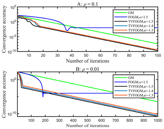 Figure 1 shows the convergence rate and precision of the proposed TVFOGM, previous FOGM, and classical GM, respectively. The previous FOGM can converge rapidly to the extreme point, but the convergence precision is limited. For the same , the proposed TVFOGM has a larger convergence rate than other methods in the initial stage, and then reduces to the same convergence rate as the classical GM after convergence to a certain precision. This reflects that the proposed method has the characteristic of a variable step size, and the precision is at least two orders of magnitude higher than that of the classical GM. For the selection of parameter , we adopted three different values, and the performance of the TVFOGM did not change greatly. The robustness of the TVFOGM will be further studied in the following calculation.