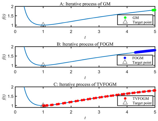 In order to improve the convergence rate, a larger iteration step size should be selected for the classical gradient method. As shown in Figure 4A, when a larger iteration step size 2 (green line) is chosen, although there is a rapid convergence rate in the initial stage, the final convergence precision is very low. When choosing a smaller iteration step size, the classical GM can achieve a rapid convergence precision size, but its convergence rate will be reduced. However, the proposed TVFOGM can achieve both rapid convergence rate and high convergence precision due to it essentially being a variable step-size method, as shown by the black line in Figure 4A. We also discuss the selection of auxiliary parameters and . As shown in Figure 4B, the two additional auxiliary parameters have little effect on the convergence rate of the proposed method so that the parameters can be selected to be approximately the same as the previous Simulation I, such as and −1.5. Given the same and number of iterations, one can observe that the proposed TVFOGM can quickly converge to the extreme point, whereas the classical GM and FOGM only iterate forward a short distance in Figure 5.