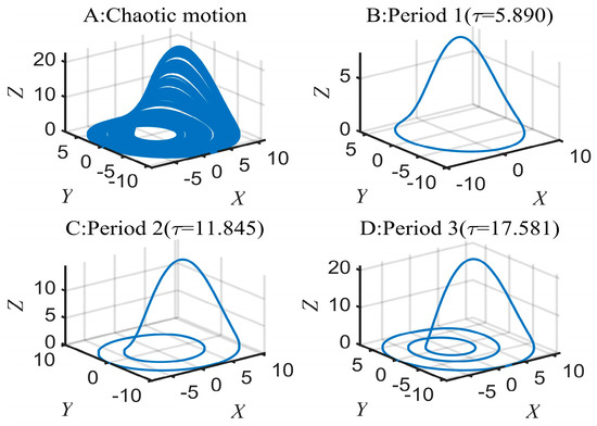 Given the initial value , , , and parameters , , , the uncontrolled system (i.e., u(t) = 0) will exhibit chaotic behavior, as shown in Figure 7A. Take the control function . The results shown in Figure 7B,C are the periodic solutions of the controlled system with the time delay as either 5 or 6, both with the feedback gain of .