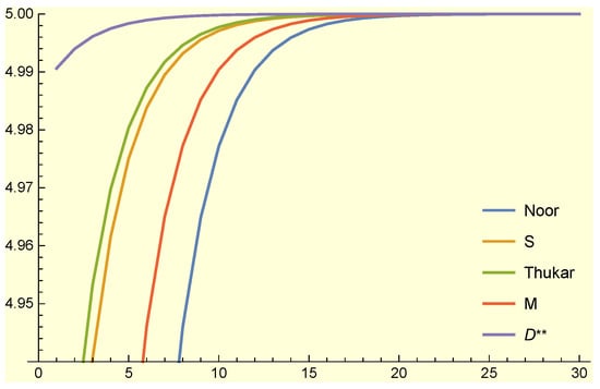The numerical and graphical comparison between the Noor, S, Thukar, M, and irritative methods are given in Table 2 and Figure 2, respectively.