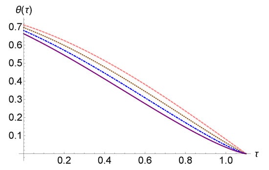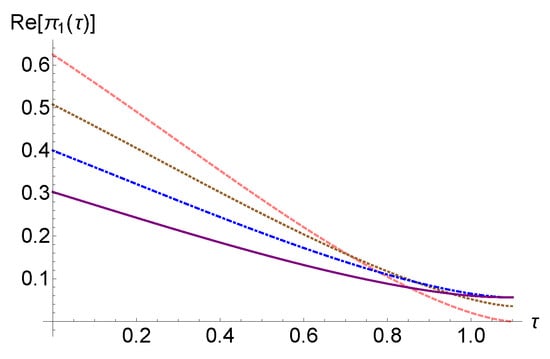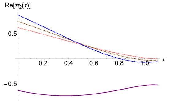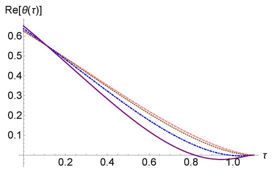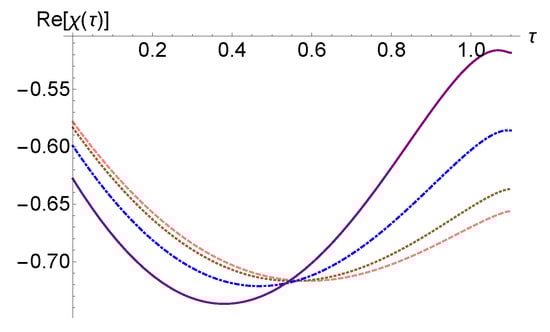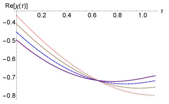 In Figure 1, we have represented the solution (5) for the case where , and in Figure 2, we have represented the same solution in the case of . In Figure 2, we plotted for the situation where , with different values of , concluding that the graph of the function depends on the imaginary part of . On the other hand, compared to Figure 1, in Figure 2, all graphs for intersect the graph corresponding to the real case, also outside the point .