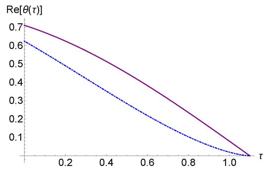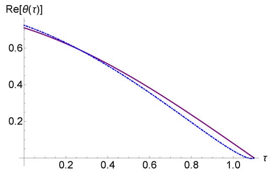 In Figure 7, for the case where , we have represented with continuous (purple) and with dashed–dotted (blue) . The point of intersection gives us the solution of Equation (10). Equation (10) does not always have a solution. In Figure 8, we have represented the graphs of for (continuous, purple) and for (dashed–dotted, blue), and it can be seen that the two graphs do not intersect.