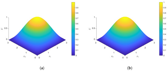 Figure 1 shows the exact solution and approximate solution for Problem 1 obtained by the parallel matrix sweep algorithm for grid size , , and the order of fractional derivative . The approximate solutions obtained by the matrix sweep and parallel matrix sweep methods coincide with each other up to the machine precision (, as we used the double precision format).