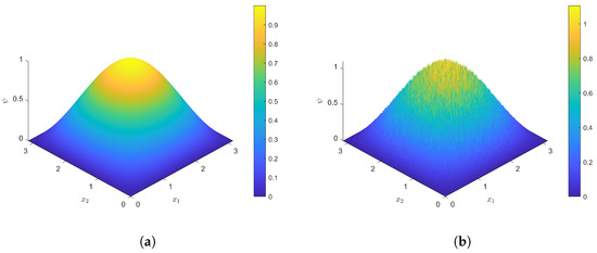 Results of Experiment 2 for Problem 1: (a) exact solution ; (b) approximate solution obtained by the regularized conjugate gradient method with noise level .