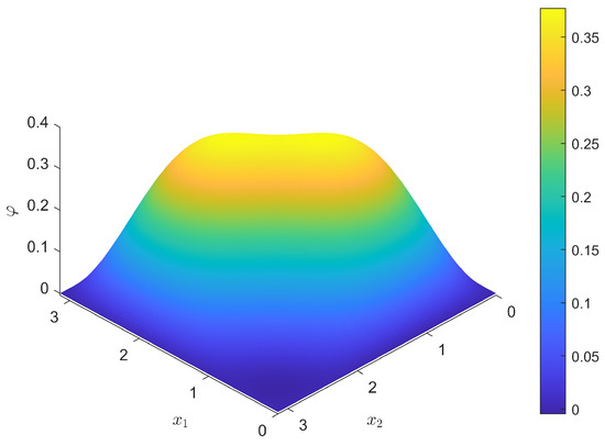 The numerical experiment consists of solving the inverse problem for Equation (34). We assume that . Additional data are obtained by solving the direct problem substituting exact . They are shown in Figure 3.