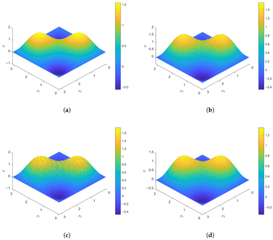 Results of experiments for Problem 2: approximate solution obtained by the regularized conjugate gradient method with noise level (a) ; (b) ; (c) ; and (d) .