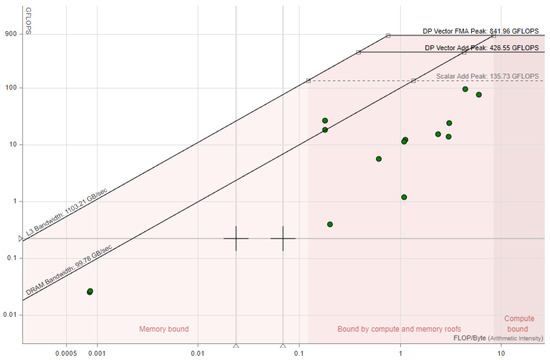 Roofline analysis for various subroutines (represented by dots) of parallel code for 16 OpenMP threads.