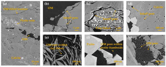 SEM images of different matrix constituents and pores. (a) An overall view of mineral distribution and close-up views of different pore types, i.e., (b,c) InterP pores, (d) IntraP pores and (e–g) OM-hosted pores, are shown in this figure.