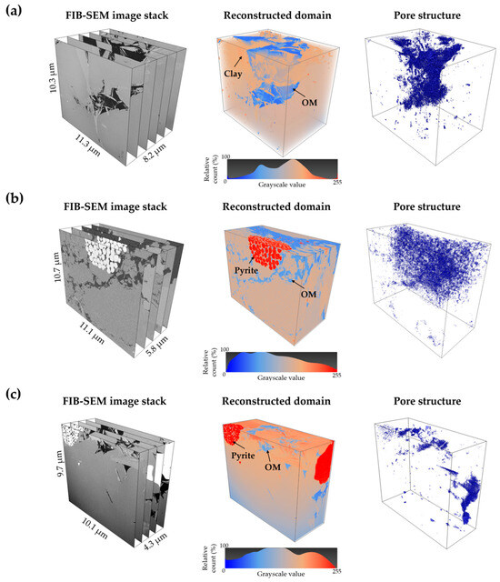 FIB-SEM image stacks and the reconstructed digital rocks. Results of three shale samples are displayed in (a), (b) and (c), respectively.