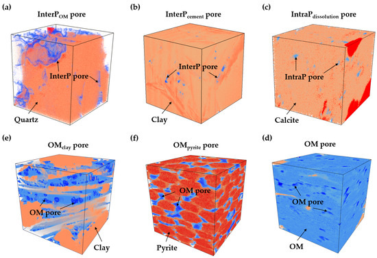 Reconstructed subdomains for different subtypes of pores, i.e., (a) OM-associated InterP pores, (b) cement-associated InterP pores, (c) dissolution IntraP pores and OM pores, in the (d) clay flakes, (e) pyrite framboids and (f) in-place kerogen, respectively. Two subdomains for each subtype of pore were analyzed in this paper, while one of them is presented here for illustration.