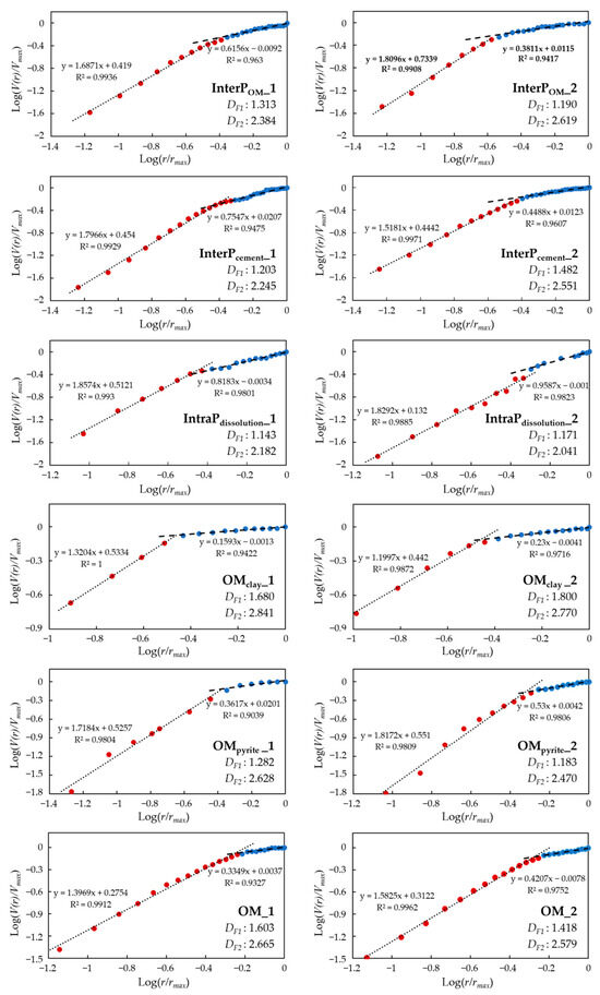 As shown in Figure 4, the data points on the Log–Log plots of and fall into two linear segments, highlighted in red and blue, respectively, and the corresponding fractal dimensions, DF1 and DF2, were defined and calculated. For all the types of pores, the values of DF1, varying from 1.143 to 1.800, are lower than those of DF2, varying from 2.041 to 2.841. According to Equation (3), used for D determination, DF1 can be an indicator of fractal geometry for smaller pores, while DF2 is more associated with larger pores. In this regard, the heterogeneity in the pore size of relatively large pores is stronger; that is, they have a more heterogeneous distribution, than that of relatively small pores. Furthermore, higher values of DF can translate to a larger surface area with more complexity in pore geometry [27]. All the correlation coefficients of the linear regression analysis are larger than 0.9, indicating that the pore system of shale is self-similar and has apparent fractal features, especially in small pore distributions.