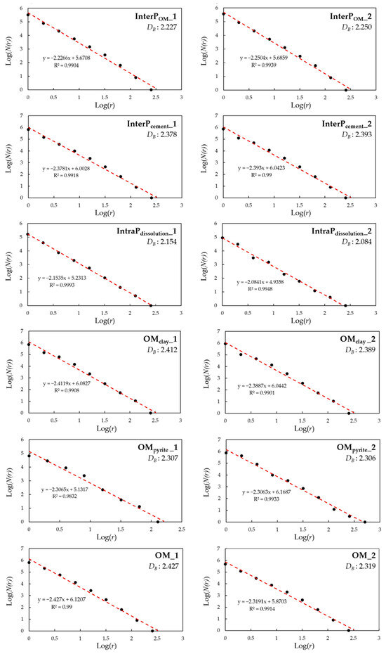The D is also calculated using 3D binary images of subdomains to estimate the spatial complexity of different pore types in shales. Figure 5 summaries the Log–Log plots, and the corresponding DB ranges from 2.084 to 2.427 with an average value of 2.304. The rounded and isolated IntraP pores led to a simple texture in space, while the OM pores differed by the development location and process, which complicated the pore structure. Previous studies have stated that spongy OM pores generally have a smaller size compared bubbled pores, which form along with trapped fluid or in cracked bitumen [10]. The coexistence of these pores results in a more heterogeneous distribution of pores in size and space, as well as a larger DB. Compared to other subtypes of OM pores, the OM-hosted pores located in pyrite framboids have a relatively uniform pattern, controlled by the arrangement of pyrite grains. In addition, a higher DB is determined from InterP pores at clay–mineral interfaces rather than the OM–mineral ones. As mentioned above, the InterPcement pores occurring between framework mineral grains and occluded with clay can contribute to a complex spatial texture due to random crystal orientations and clay floccules. Overall, DB correlates positively with porosity, whereas it has a weak correlation with the average pore diameter, indicating pore tortuosity and connectivity subjected to spatial distribution govern the pore network to a greater extent.