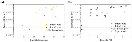 Pore-type-dependent (a) fractal dimension and (b) porosity versus permeability. Experimental data of permeability originate from the work of Li (2013) for shale samples collected from the Weiyuan area as well [41].