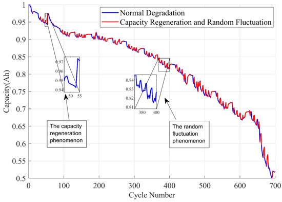 Figure 1 illustrates the capacity curve for cell CS2_36, representative of the CALCE dataset’s CX2 series, under a standard charging regime. The cells experienced a constant current charge at 0.5 C to 4.2 V, followed by constant voltage until the current declined to below 0.05 A, and a consistent discharge cut-off at 2.7 V. The blue line in the figure traces the anticipated monotonic capacity decline under typical degradation conditions. In contrast, the red line captures deviations from this norm, manifesting as sporadic capacity increases attributable to regeneration events and stochastic fluctuations. Such patterns reflect a complex degradation process not confined to Gaussian behavior, hence the application of Lévy stable motion to model the observed anomalies. This approach, with its heavy-tailed statistical properties, effectively captures abrupt transitions in battery capacity degradation [24]. This technique is suitable for capturing sudden jumps in degradation processes. Liu et al. [25] employed incremental distribution with fractional Lévy stable motion to establish an iterative predictive model by using Monte Carlo simulation. This model primarily addresses non-Gaussian characteristics of the degradation process. However, a drawback of the model is that it assumes that the drift coefficients follow a normal distribution and are not dynamically updated. This limitation significantly affects the accuracy of RUL predictions for lithium-ion battery devices.