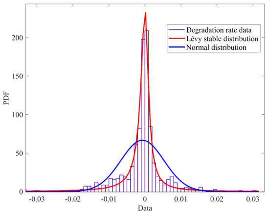 In the degradation process of LIBs, available capacity does not exhibit a strict monotonic decrease. Instead, it alternates between sudden increases and gradual decreases due to the presence of random fluctuations and capacity regeneration phenomena. Consequently, the decay rate deviates from the Gaussian assumption. Figure 2 shows the fitting of the capacity degradation rate distribution by using the dataset obtained from the CS2-36 battery [27,28,29]. Different fitting curves clearly demonstrate that a steady-state distribution is more relevant for our simulation. This observation emphasizes the importance of Levy stable distribution for a precise description of the degradation trend.