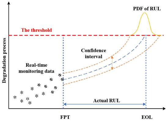 where is the current time of the degradation process, is the time of RUL, is the prediction starting point FPT, and is the set fault threshold.