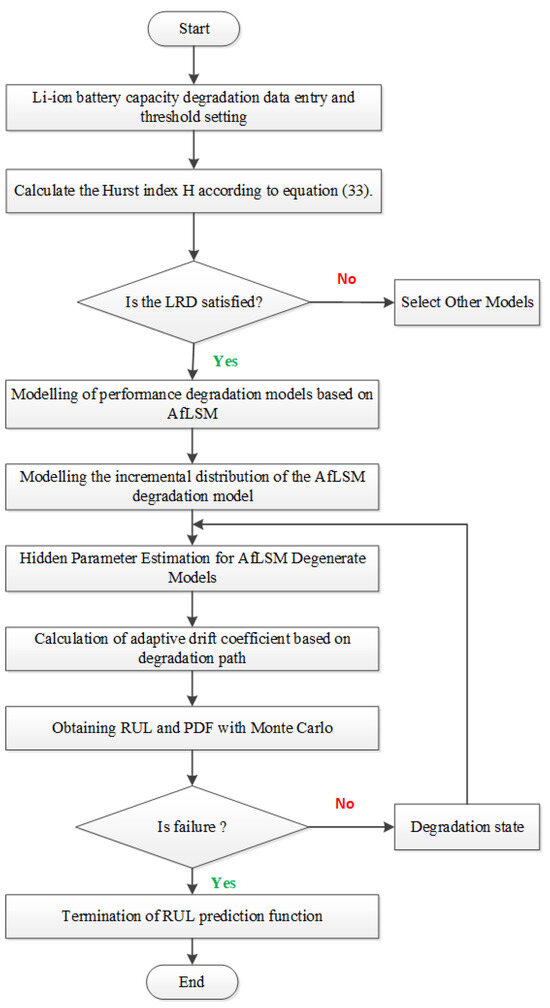 To address these challenges, we propose a lithium-ion battery performance degradation model based on AfLSM optimized by a genetic algorithm. This model offers more flexibility in characterizing properties such as long-range dependence, non-Gaussianity, and heavy-tailed distributions of the stochastic incremental process. Additionally, the model enables adaptive updates of nonlinear drift coefficients based on the degradation path to accommodate different operating conditions. The PDFs of RUL obtained using the Mellin–Stieltjes transform combined with Monte Carlo simulation are more accurate than the results obtained from direct Monte Carlo simulation.