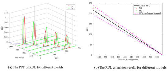 According to Table 3, model M1, which takes into account the adaptive drift of nonlinear coefficients, exhibits smaller values of RMSE and MAE, as well as larger values of COS and HD, compared to the M2 model, which does not consider the nonlinear drift. These results indicate that the prediction model’s overall performance is improved when the nonlinear coefficients are adaptively updated along the degradation path.