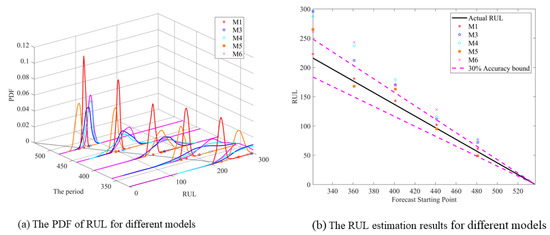 To conduct a comprehensive comparison of the single-point RUL prediction results across different methods, the predictions and corresponding PDF curves are separately analyzed at various observation moments during the degradation of LIBs. The analysis results are depicted in Figure 7. Specifically, Figure 7a–e present the prediction results for five different observation cycle periods: 321, 361, 401, 441, and 481. Upon examining these figures, it is evident that the M1 model proposed outperforms the four models M3–6. This superiority is reflected in the M1 model RUL predictions, which are closer to the actual values indicated by the black dashed lines.