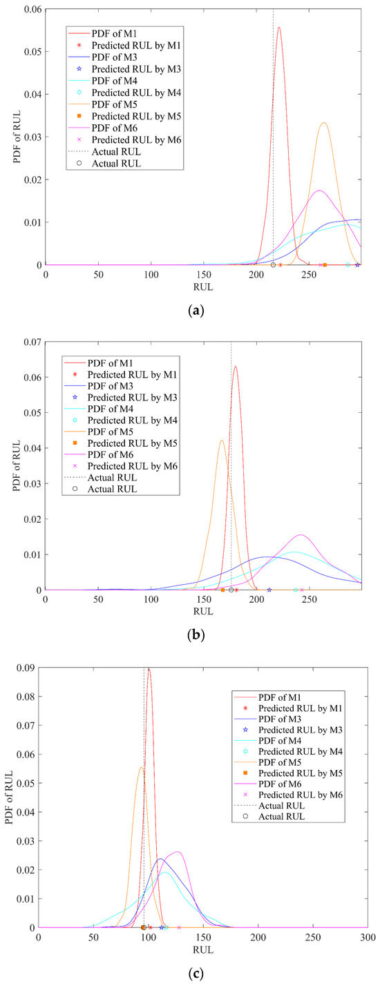 Moreover, to assess the uncertainty of the RUL prediction results quantitatively, the PDF curves of the prediction outcomes are thoroughly analyzed and compared throughout the entire performance degradation process of LIBs. The comparison results between the RUL predictions of M1 and those of M3, M4, M5, and M6 are presented in Figure 6 and Figure 7. Observing these figures, it is evident that the PDF curve of the proposed method, referred to as M0, exhibits greater height and steepness compared to the corresponding PDF curves of the other methods. This observation suggests that the RUL prediction model proposed in this paper achieves higher prediction accuracy and reliability.