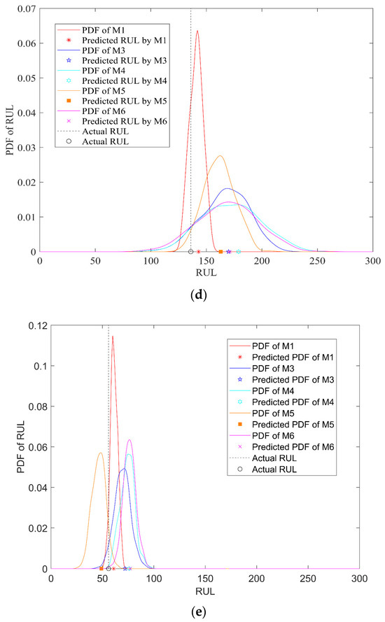 RUL prediction and PDF analysis for M1, M3, M4, M5, and M6 at different observation times. (a) RUL prediction and PDF analysis with a prediction starting point of 321 cycles; (b) RUL prediction and PDF analysis with a prediction starting point of 361 cycles; (c) RUL prediction and PDF analysis with a prediction starting point of 401 cycles; (d) RUL prediction and PDF analysis with a prediction starting point of 441 cycles; (e) RUL prediction and PDF analysis with a prediction starting point of 481 cycles.