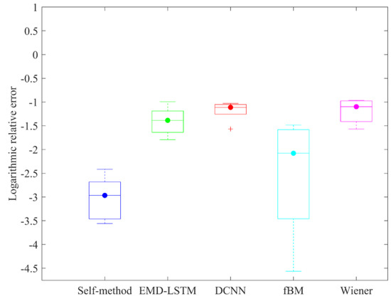 To conduct a systematic analysis of LRE in the prediction results, box plots were generated to illustrate the distribution of LRE errors for the four prediction models. The box-and-line plot is presented in Figure 8. Notably, the SELF method proposed in this paper exhibits a clear minimum median in the box plot and a smaller interquartile range, indicating a more concentrated central tendency and lower volatility in the prediction error distribution compared to the other three assessment methods. Conversely, although the DCNN method has the smallest box plot, the presence of outliers suggests high fluctuations in the prediction errors, leading to unstable prediction results. The EMD-LSTM method and the Wiener method demonstrate larger central values, despite having slightly smaller box plots compared to our proposed method, indicating relatively lower overall accuracy.