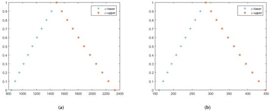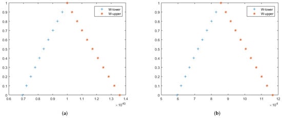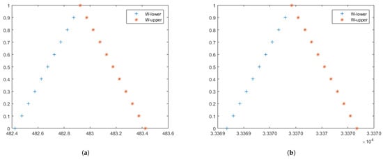 The approximate lower and upper solutions of (167) at (a–c) , 1.50, 1.75, respectively. Moreover, (a–c) are 2D figures for the approximate solutions of the fuzzy fractional wave equation on the Cantor set of  in Example 6.
