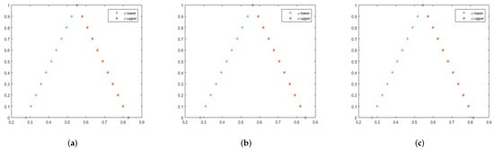 In Figure 5, we plot  graphs of the approximation solutions for fuzzy fractional wave equations on Cantor set. Figure 5a shows that for , the fuzzy fractional wave equation becomes bounded and closed. Moreover, the  sign shows increasing functions and  denotes decreasing functions on the -level set of . To reflect the concept of the -level set, Figure 5a illustrates that the -level set of the fuzzy fractional wave equation is bounded and closed for . Similarly, in Figure 5b,c, we can observe the same explanation of the -level set closedness and boundedness for Example 6.