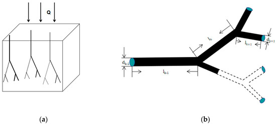 In order to consider an asymmetric tree-like bifurcation network, we assume that p channels of the kth branching level have been damaged, but the other parts of the network are intact. For example, if a branch of the tree-like bifurcation network in Figure 1b is damaged, the damaged part will not generate new branches, and the undamaged part will not be affected.